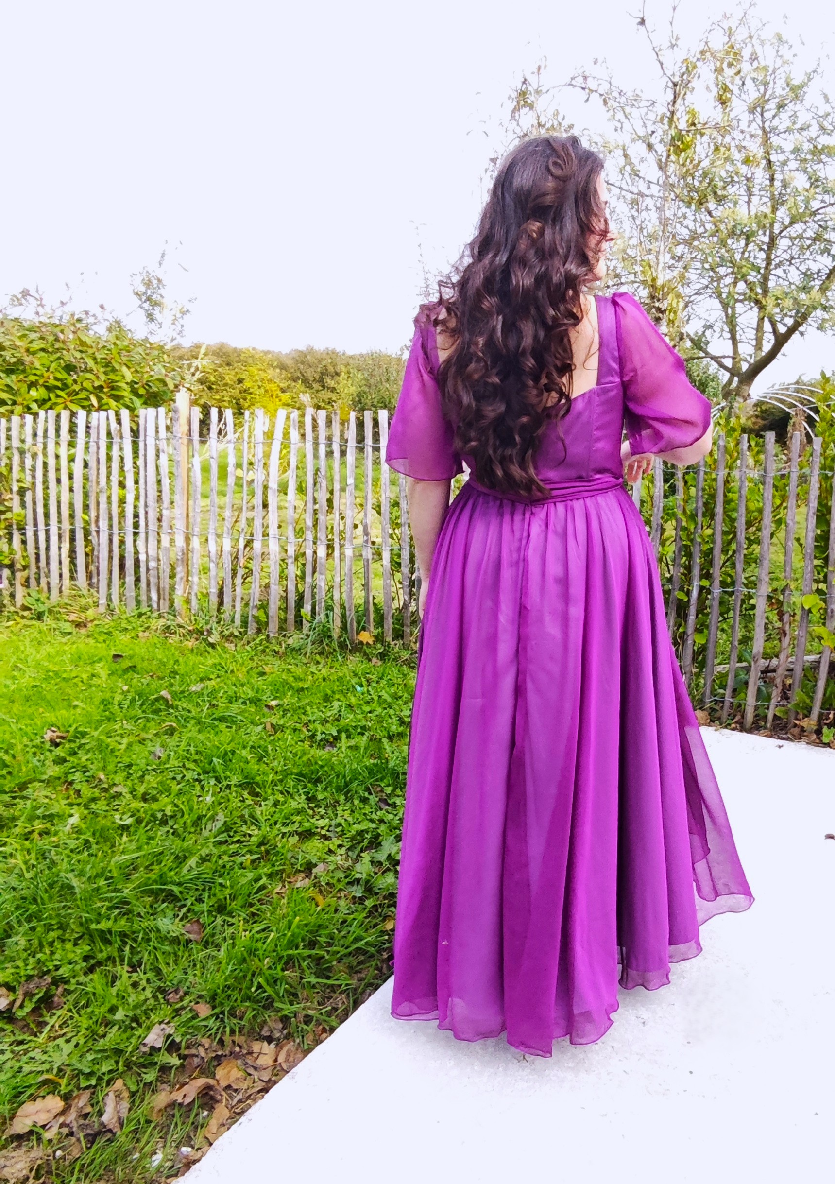 Réalisée dans un satin lilas délicat, la base de la robe offre une brillance soyeuse qui capte la lumière à chaque mouvement. Par-dessus, une mousseline violette vient se superposer avec légèreté, créant un jeu subtil de transparence et de reflets.